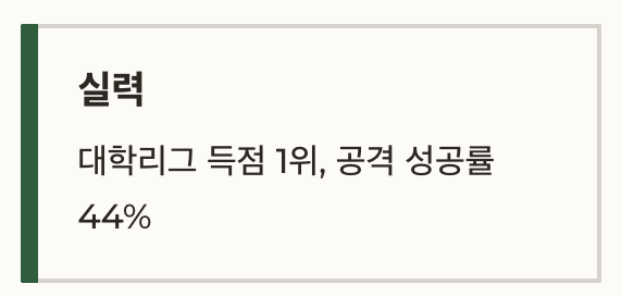 | 실력 | 대학리그 득점 1위, 공격 성공률 44% |