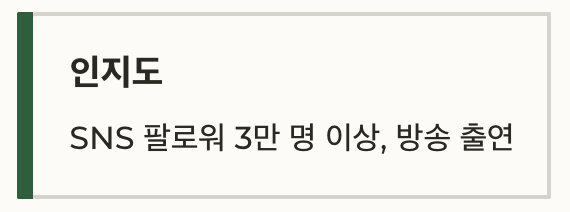 | 인지도 | SNS 팔로워 3만 명 이상, 방송 출연 |