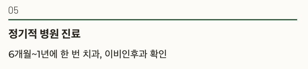 | 정기적 병원 진료 | 6개월~1년에 한 번 치과, 이비인후과 확인 |