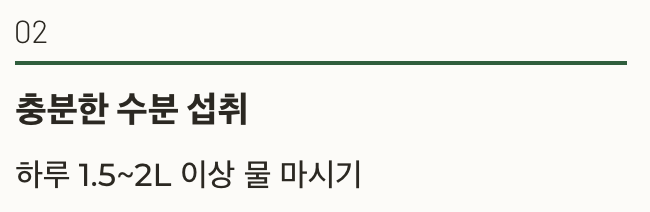 | 충분한 수분 섭취 | 하루 1.5~2L 이상 물 마시기 |