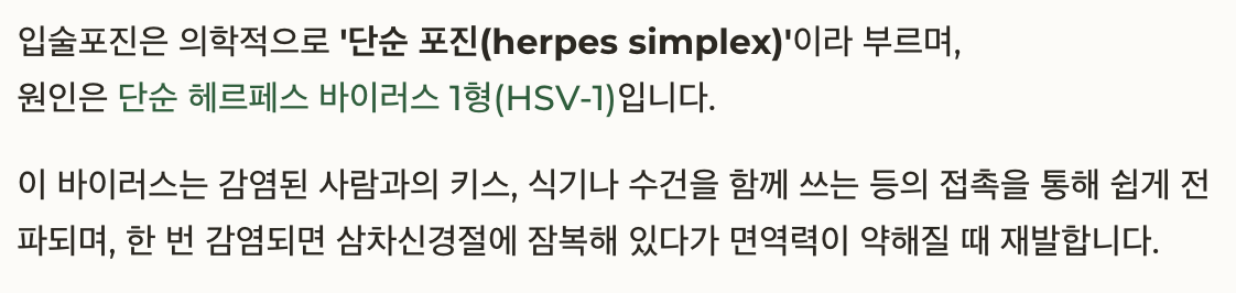 입술포진은 의학적으로 ‘단순 포진(herpes simplex)’이라 부르며, 원인은 단순 헤르페스 바이러스 1형(HSV-1)입니다.
