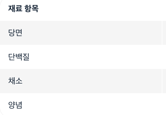 | 단백질 | 돼지고기(잡채용) 80g | 사각 어묵 2장 반 |
