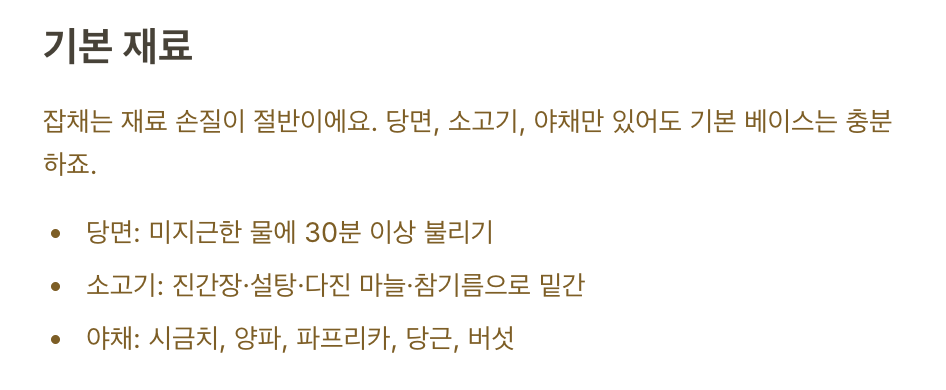 잡채는 재료 손질이 절반이에요. 당면, 소고기, 야채만 있어도 기본 베이스는 충분하죠.