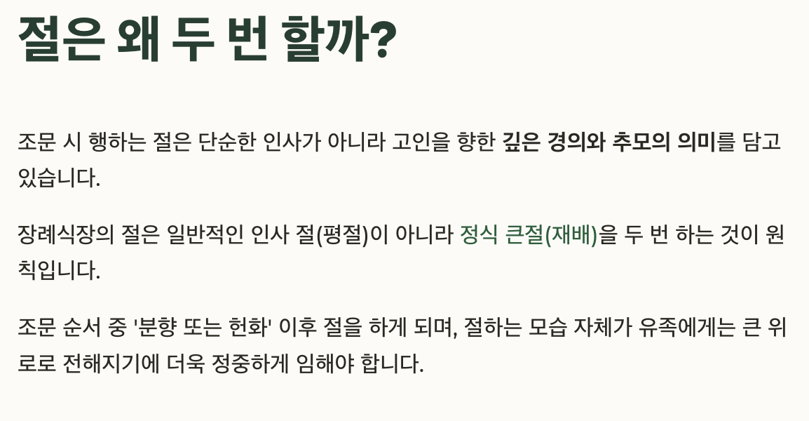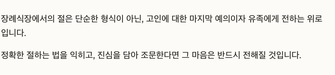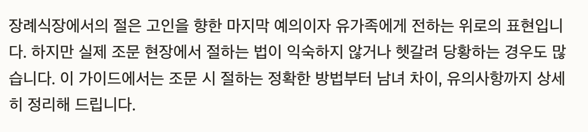 장례식장에서의 절은 고인을 향한 마지막 예의이자 유가족에게 전하는 위로의 표현입니다. 하지만 실제 조문 현장에서 절하는 법이 익숙하지 않거나 헷갈려 당황하는 경우도 많은데요. 이 글에서는 조문 시 절하는 정확한 방법부터 남녀 차이, 유의사항까지 정리해 드리겠습니다.