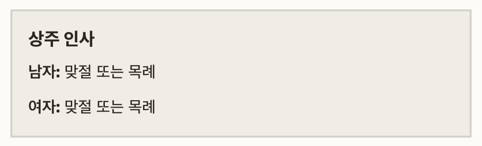 절 후에는 고개를 숙인 채 유족에게 목례하거나 맞절을 하는 것이 예의입니다.