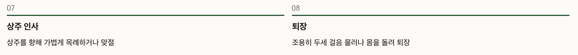 1단계 – 분향 또는 헌화 후, 영정 사진 앞에 선다 2단계 – 공수 자세로 고인을 향해 선다 3단계 – 남성은 왼 무릎부터, 여성은 두 무릎을 꿇는다 4단계 – 상체를 깊이 숙여 큰절 1회 5단계 – 다시 자세를 바로잡고 큰절 1회 더 6단계 – 공수 자세로 천천히 일어난다 7단계 – 상주를 향해 가볍게 목례하거나 맞절 8단계 – 조용히 두세 걸음 물러나 몸을 돌려 퇴장