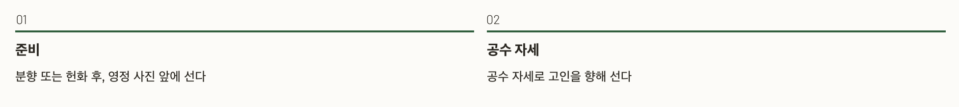 1단계 – 분향 또는 헌화 후, 영정 사진 앞에 선다 2단계 – 공수 자세로 고인을 향해 선다 3단계 – 남성은 왼 무릎부터, 여성은 두 무릎을 꿇는다 4단계 – 상체를 깊이 숙여 큰절 1회 5단계 – 다시 자세를 바로잡고 큰절 1회 더 6단계 – 공수 자세로 천천히 일어난다 7단계 – 상주를 향해 가볍게 목례하거나 맞절 8단계 – 조용히 두세 걸음 물러나 몸을 돌려 퇴장