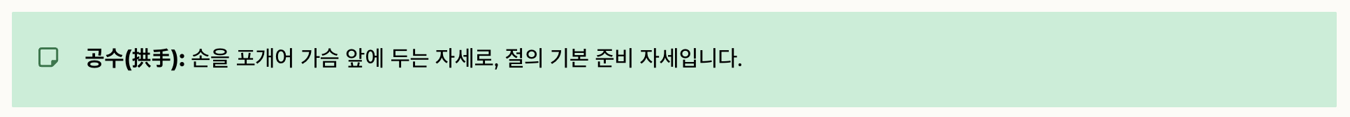 공수(拱手): 손을 포개어 가슴 앞에 두는 자세로, 절의 기본 준비 자세입니다.