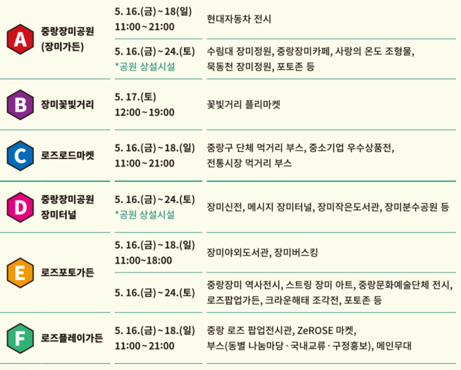 - 장미터널(D구간), 중랑장미공원(A구간): 5.16(금) ~ 5.24(토), 공원 상설운영