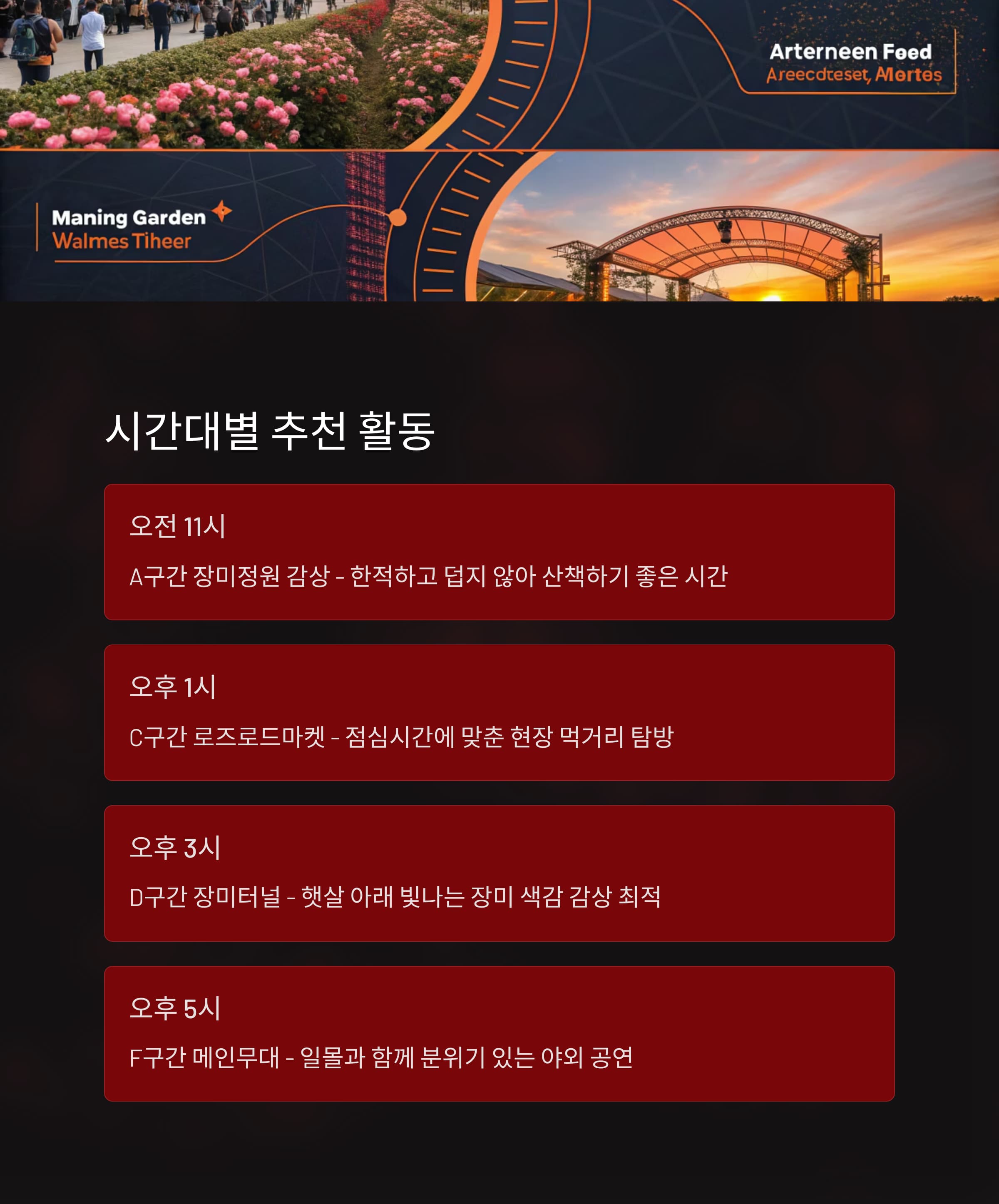 | 오후 3시 | D구간 장미터널 걷기 | 햇살 아래 빛나는 장미의 색감 감상 최적 |