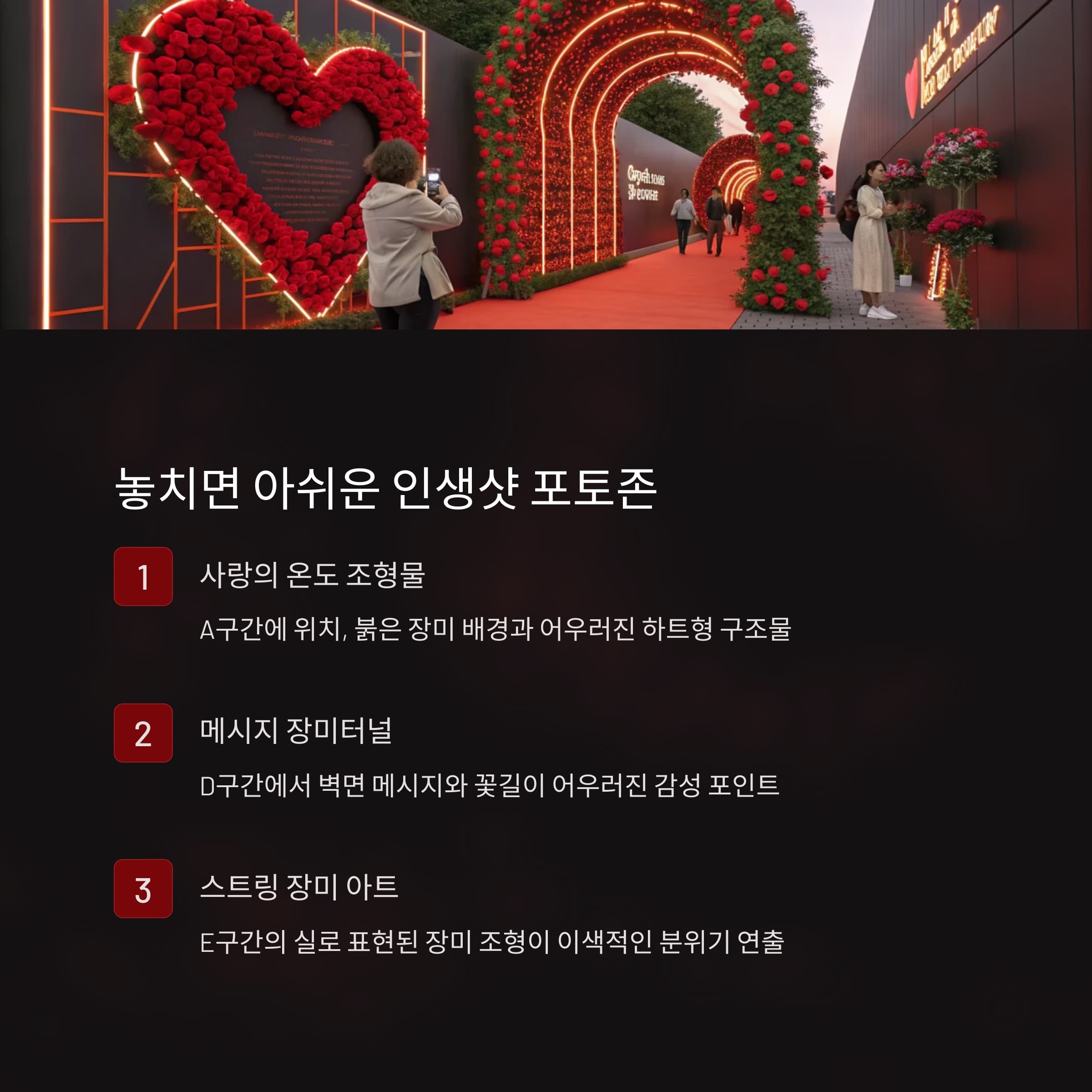 | D구간 | 메시지 장미터널 | 벽면 메시지와 꽃길이 어우러진 감성 포인트 |
