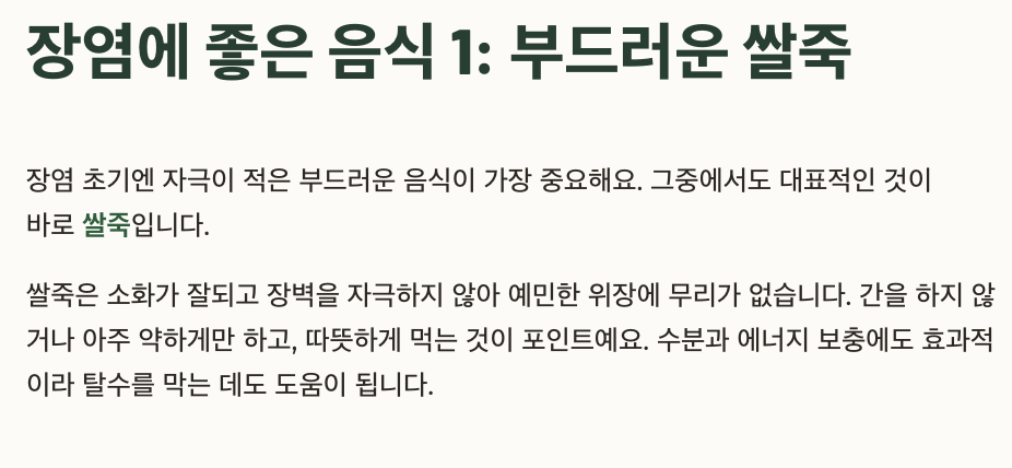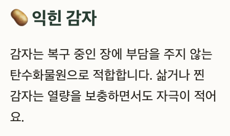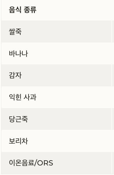 | 쌀죽 | 자극 적고 소화가 잘됨 | 싱겁게, 따뜻하게 |