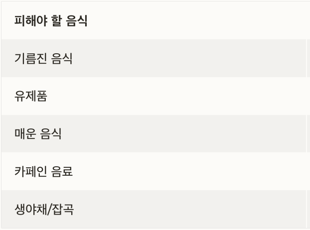 | 기름진 음식 | 소화 부담, 염증 악화 |
