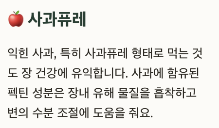| 익힌 사과 | 펙틴 성분으로 설사 완화 | 퓨레나 즙 형태 |