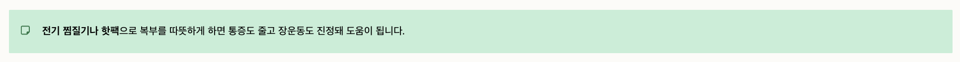 전기 찜질기나 핫팩으로 복부를 따뜻하게 하면 통증도 줄고 장운동도 진정돼 도움이 됩니다.