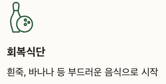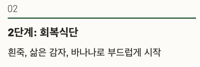 | 2단계: 회복식단 | 흰죽, 삶은 감자, 바나나로 부드럽게 시작 |