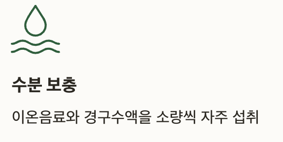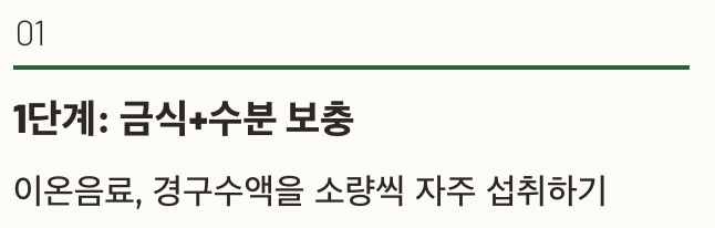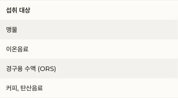 | 1단계: 금식+수분 보충 | 이온음료, 경구수액을 소량씩 자주 섭취하기 |