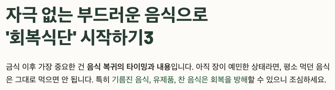 적어도 2~3일은 회복식단을 유지하고, 증상이 사라진 뒤 서서히 원래 식단으로 복귀하는 게 좋습니다.