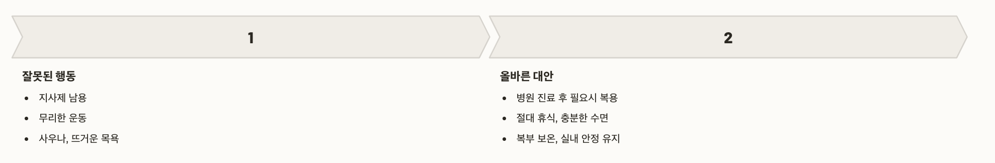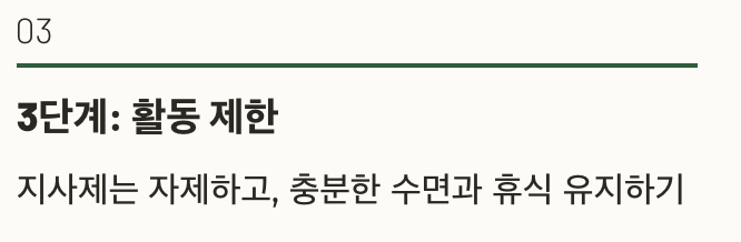 | 3단계: 활동 제한 | 지사제는 자제하고, 충분한 수면과 휴식 유지하기 |