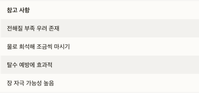 | 맹물 | 보통 | 전해질 부족 우려 존재 |
