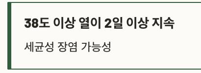 | 38도 이상 열이 2일 이상 지속 | 세균성 장염 |