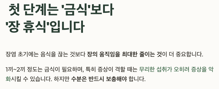장염 초기에는 음식을 끊는 것보다 장의 움직임을 최대한 줄이는 것이 더 중요합니다.
