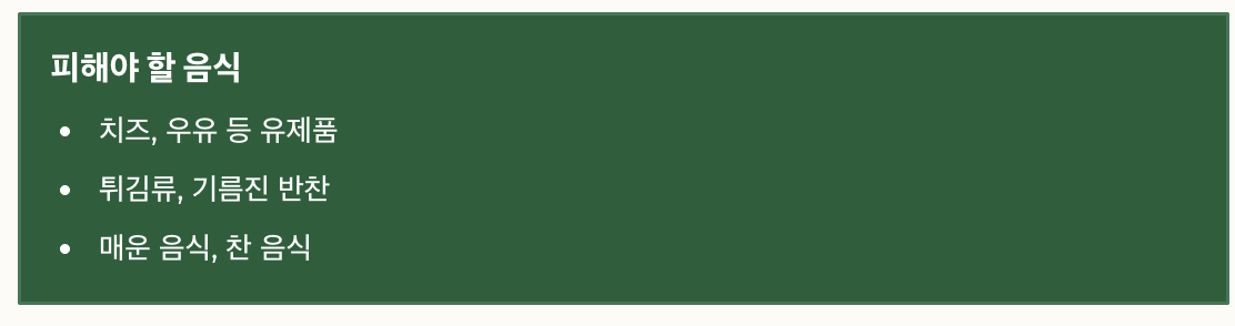 | 커피, 탄산음료 | 피함 | 장 자극 가능성 높음 |