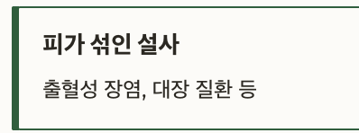 | 피가 섞인 설사 | 출혈성 장염, 대장 질환 등 |