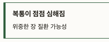 | 복통이 점점 심해짐 | 위중한 장 질환 가능성 |