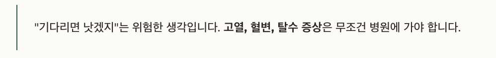 "기다리면 낫겠지"는 위험한 생각입니다. 고열, 혈변, 탈수 증상은 무조건 병원에 가야 합니다.