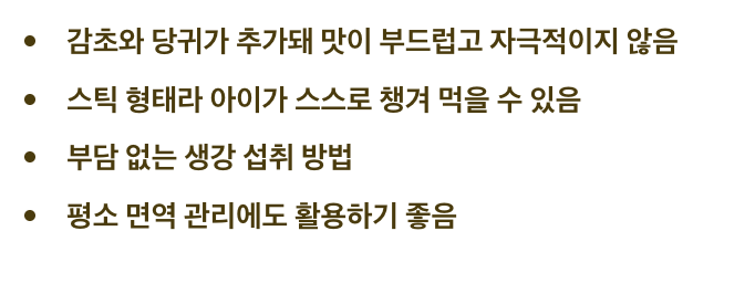 감초와 당귀가 추가돼 맛이 부드럽고, 자극적이지 않으며 스틱 형태라 아이가 스스로 챙겨 먹을 수 있죠.
