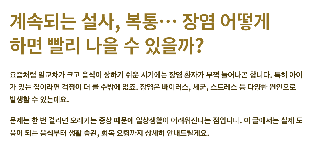 장염은 음식만 잘 먹는다고 회복되지 않습니다. 몸을 회복하기 위한 '생활 루틴'도 꼭 필요해요.