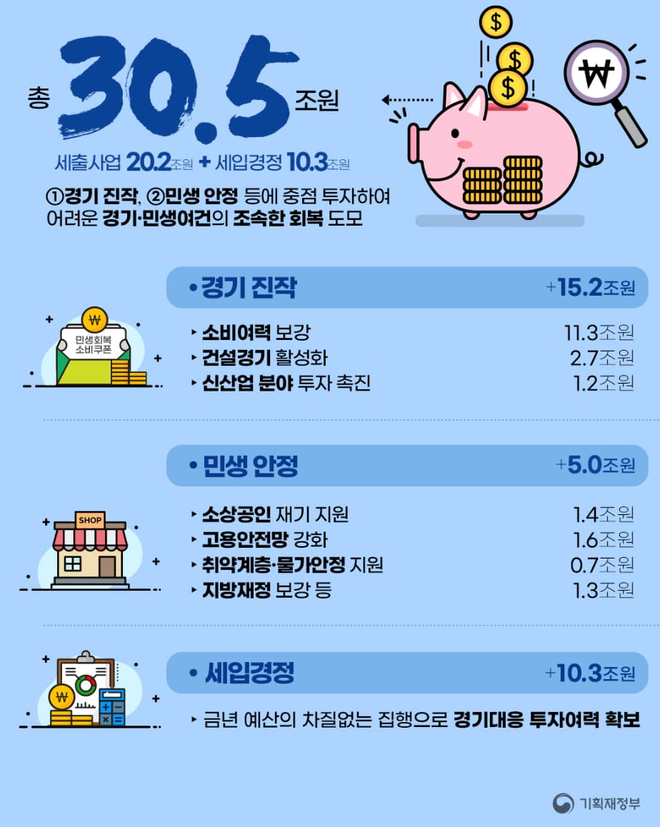 이에 정부는 30조 5천억 원 규모의 추경안을 편성하며,
