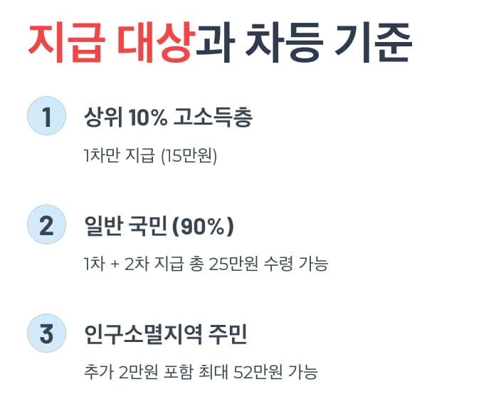 - 일반 국민은 1차 + 2차 지급 총 25만 원 수령 가능