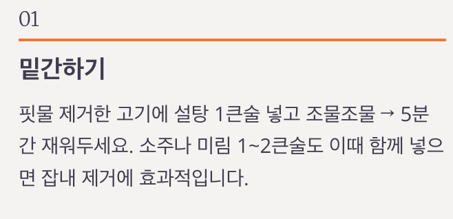 - 설탕 먼저 넣고 재우기 → 부드럽고 양념이 잘 배요