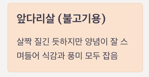 | 앞다리살 (불고기용) | 살짝 질긴 듯하지만 양념이 잘 스밈 | 식감과 풍미 모두 잡음 |