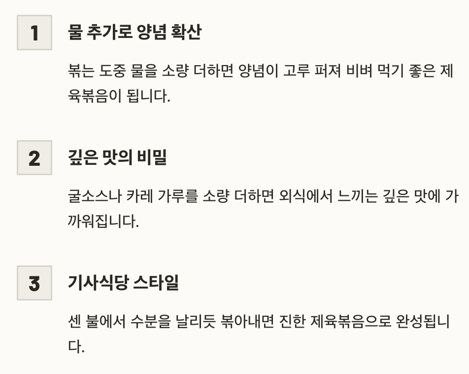 볶는 도중 물을 소량 더하면 양념이 고루 퍼져 비벼 먹기 좋은 제육볶음이 됩니다. 굴소스나 카레 가루를 소량 더하면 외식에서 느끼는 깊은 맛에 가까워집니다. 센 불에서 수분을 날리듯 볶아내면 기사식당 스타일의 진한 제육볶음으로 완성됩니다.