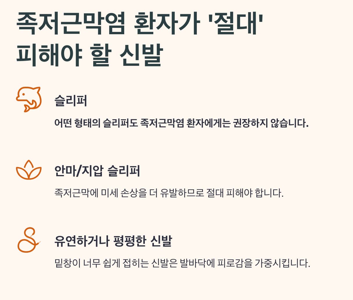 • 주의: '안마 슬리퍼'나 '지압 슬리퍼'는 족저근막에 미세 손상을 더 유발하므로 절대 피해야 합니다. 집 안에서도 되도록 푹신한 실내화를 신으시고, 맨발로 다니는 것을 피하세요.