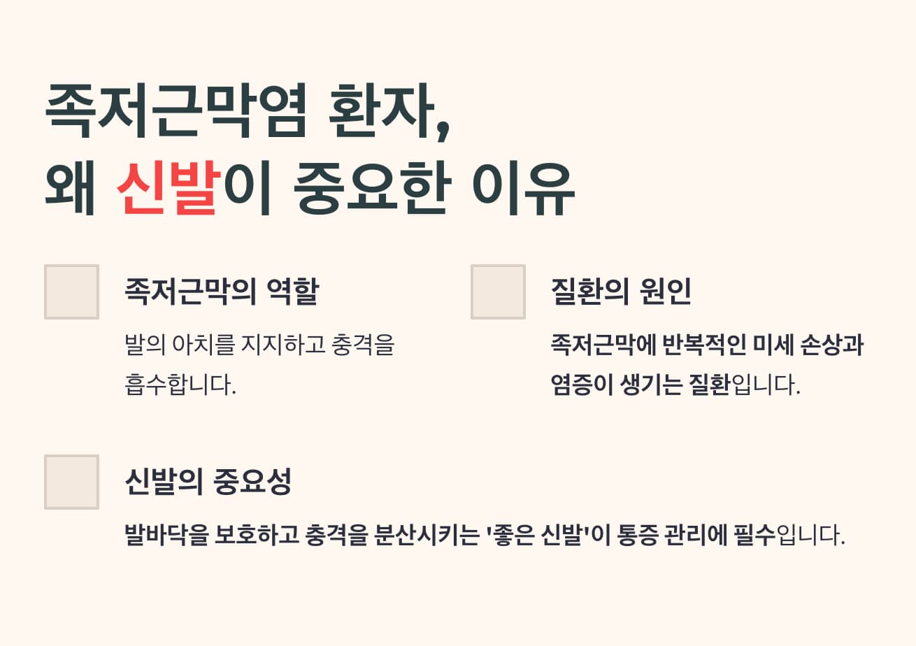 족저근막은 발의 아치를 지지하고 충격을 흡수합니다. 족저근막염은 족저근막에 반복적인 미세 손상과 염증이 생기는 질환입니다. 특히 체중이 집중되는 뒤꿈치 쪽에 통증이 많이 유발되죠. 평소 신는 신발이 단단하지 않거나 발에 맞지 않으면, 발바닥에 가해지는 충격과 스트레스가 커져 통증이 악화되고 회복이 더뎌집니다. 결국, 발바닥을 보호하고 충격을 분산시키는 '좋은 신발'이 통증 관리에 필수입니다.