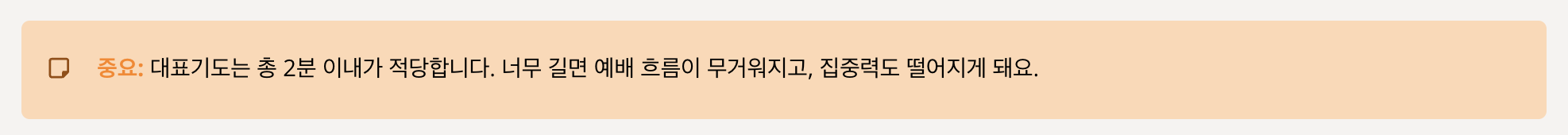 대표기도는 총 2분 이내가 적당합니다. 너무 길면 예배 흐름이 무거워지고, 집중력도 떨어지게 돼요.