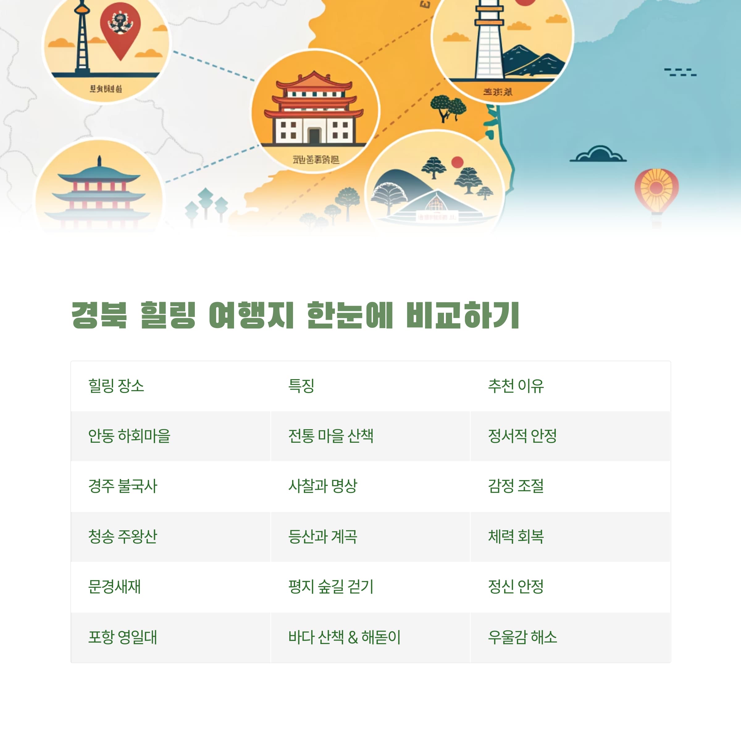 갱년기 스트레스를 줄이기 위한 경북 힐링 여행 비교표