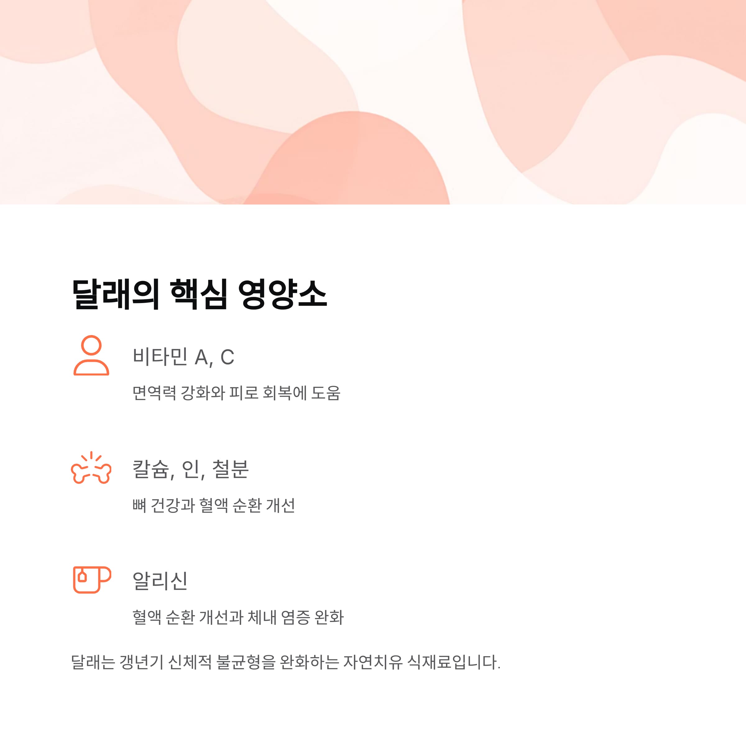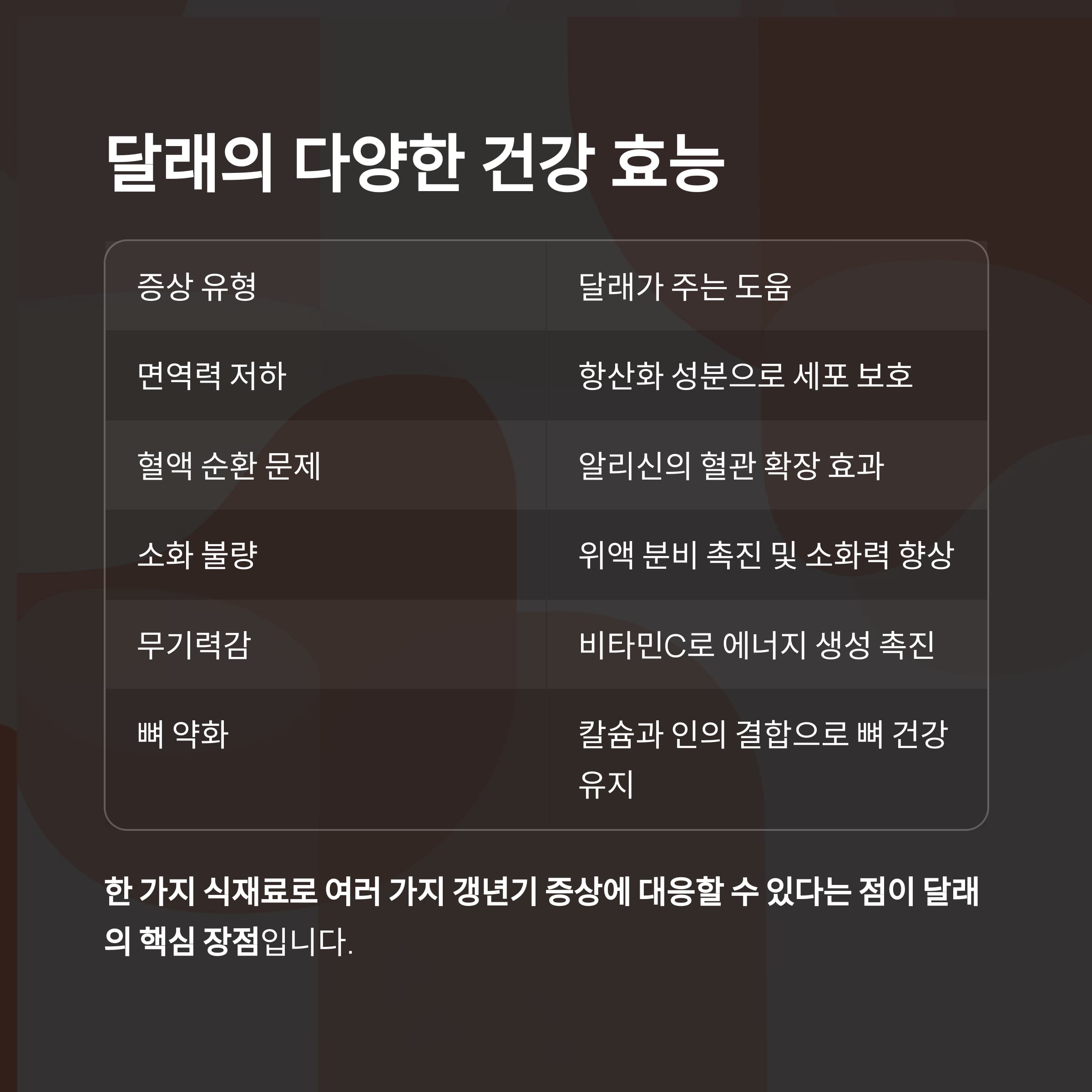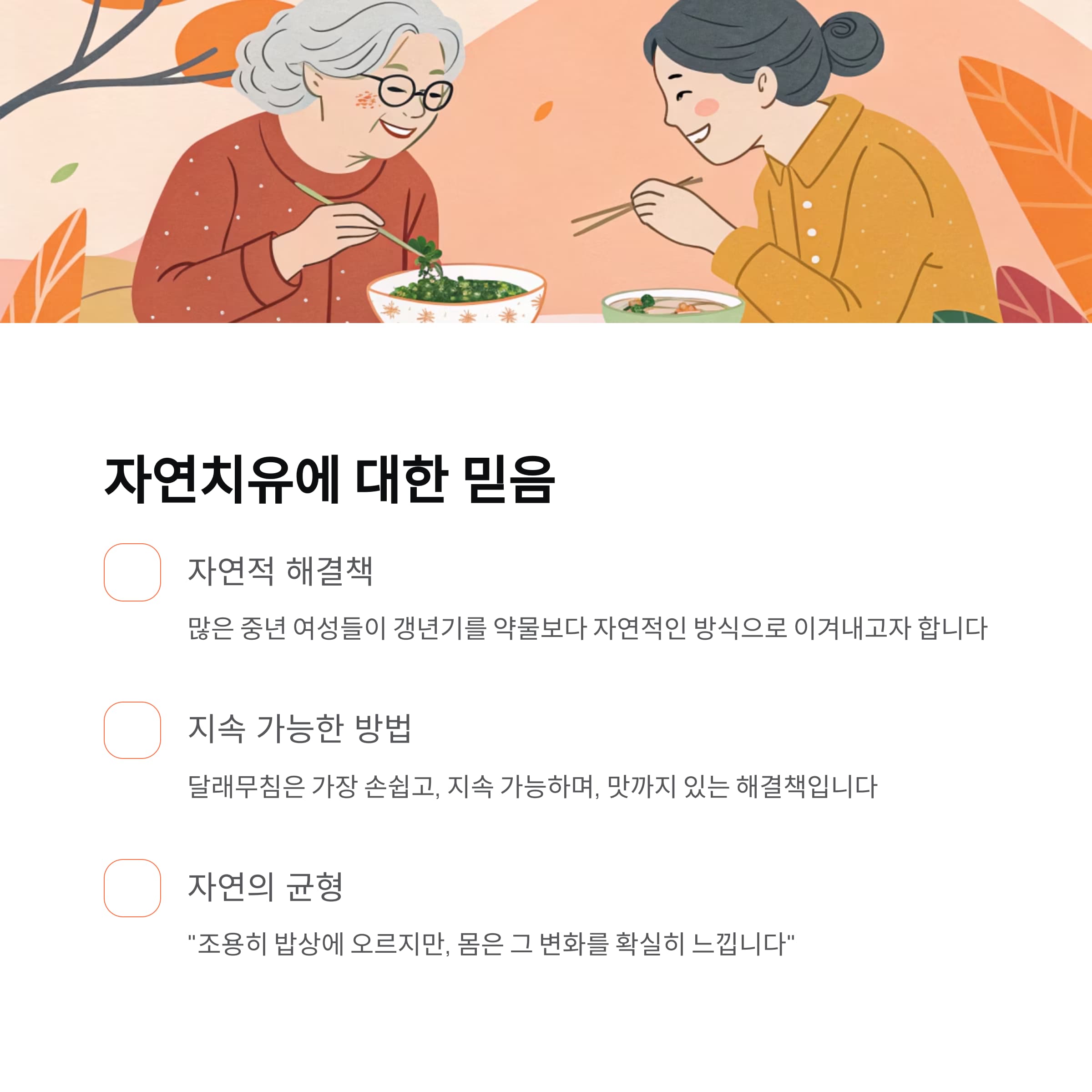 한 가지 식재료로 여러 가지 갱년기 증상에 대응할 수 있다는 점이 달래의 핵심 장점입니다.