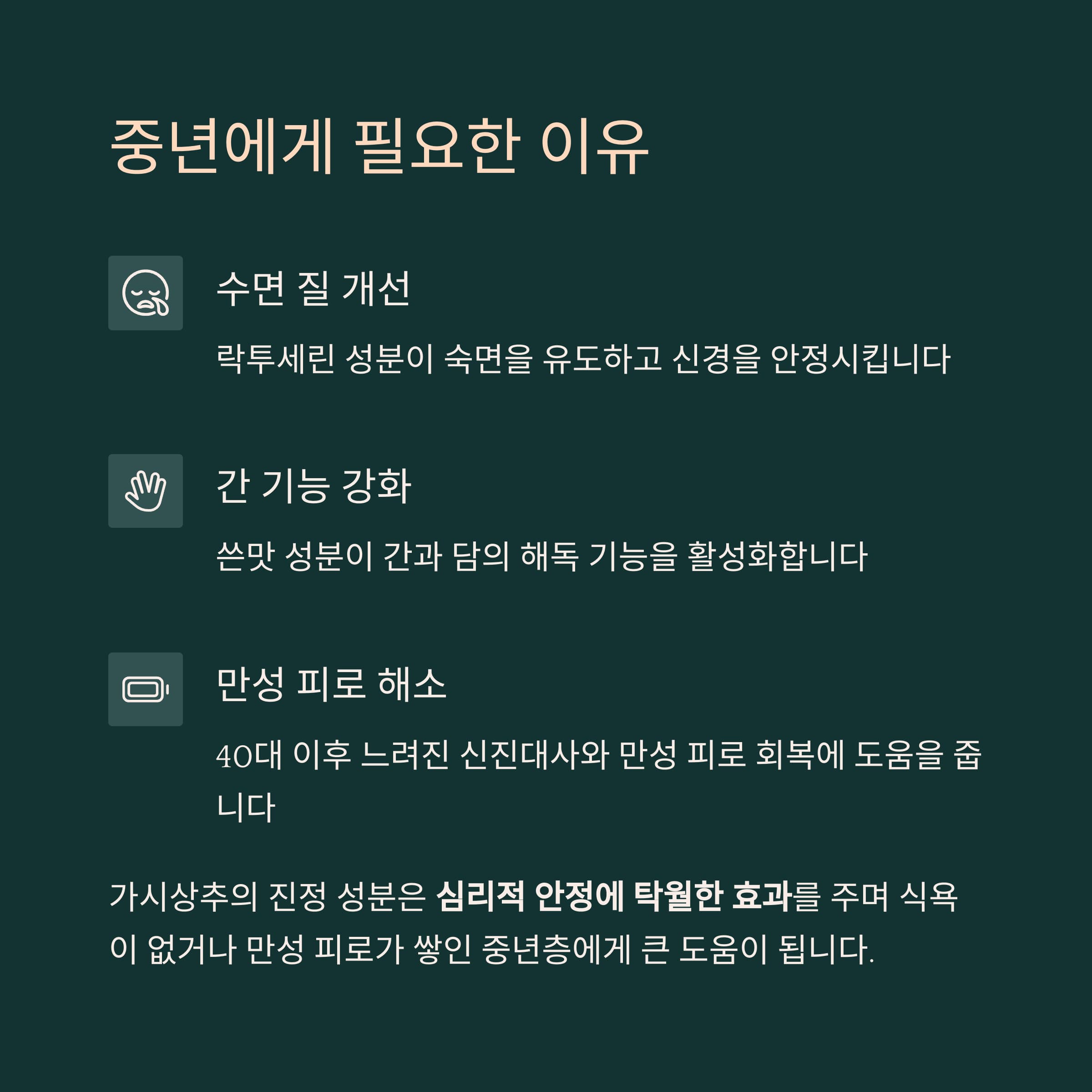 식욕이 없거나 만성 피로가 쌓인 중년층에게 큰 도움을 줍니다.