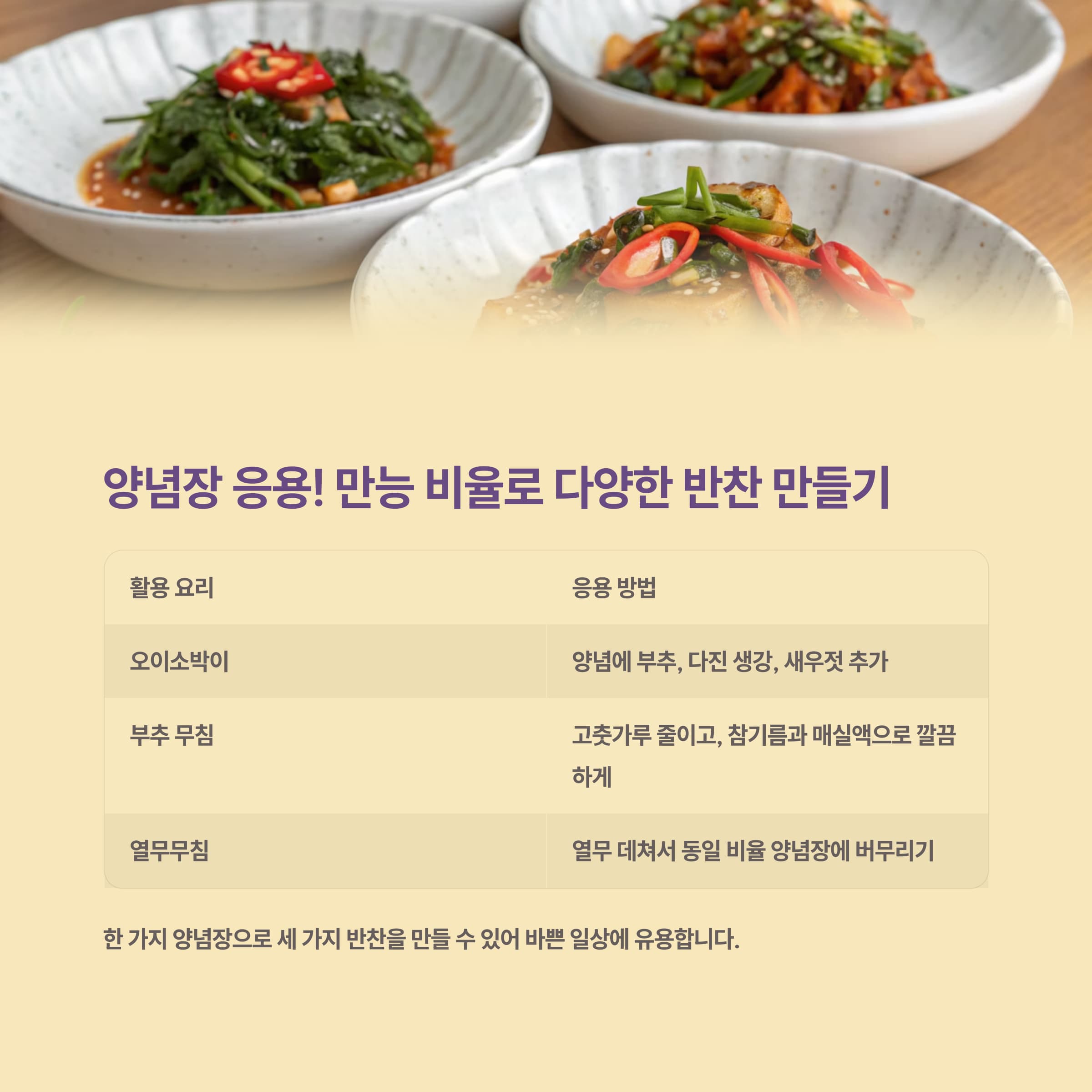 이처럼 한 가지 양념장으로 세 가지 반찬을 만들 수 있어