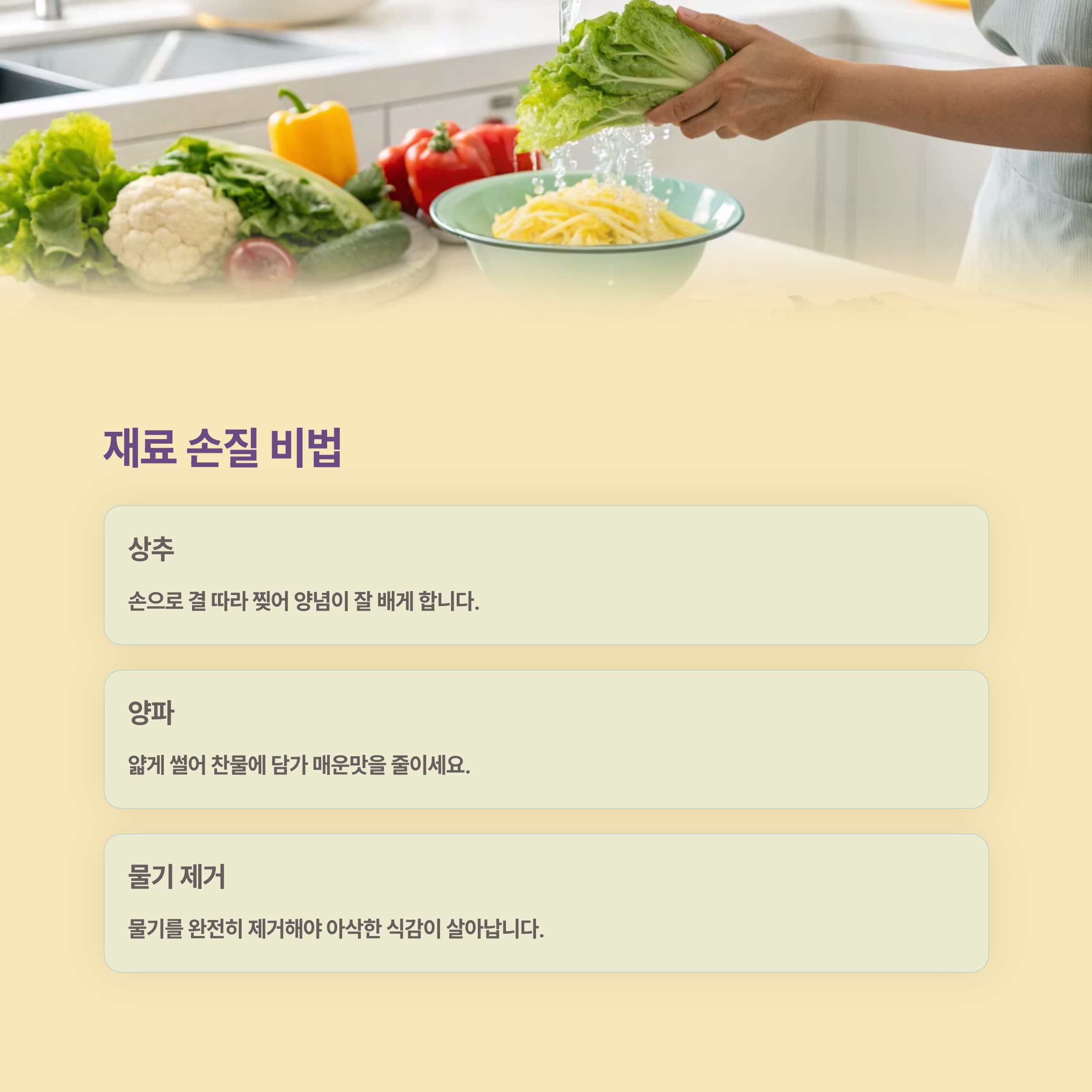 시간이 지나면 채소에서 수분이 빠져 양념이 묽어지고 맛이 떨어지거든요.