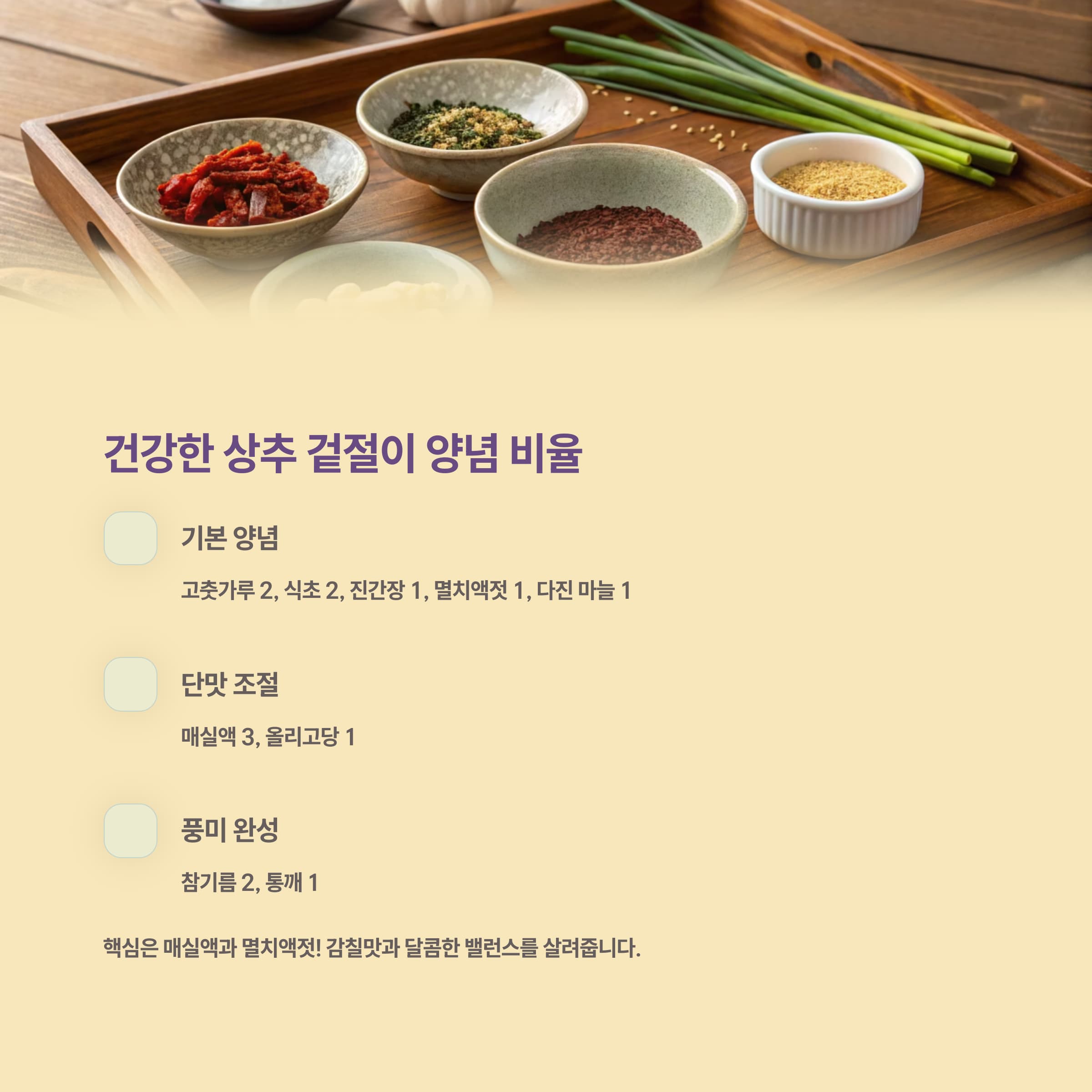 | 고춧가루 | 2 | 매콤한 색감과 향미 |