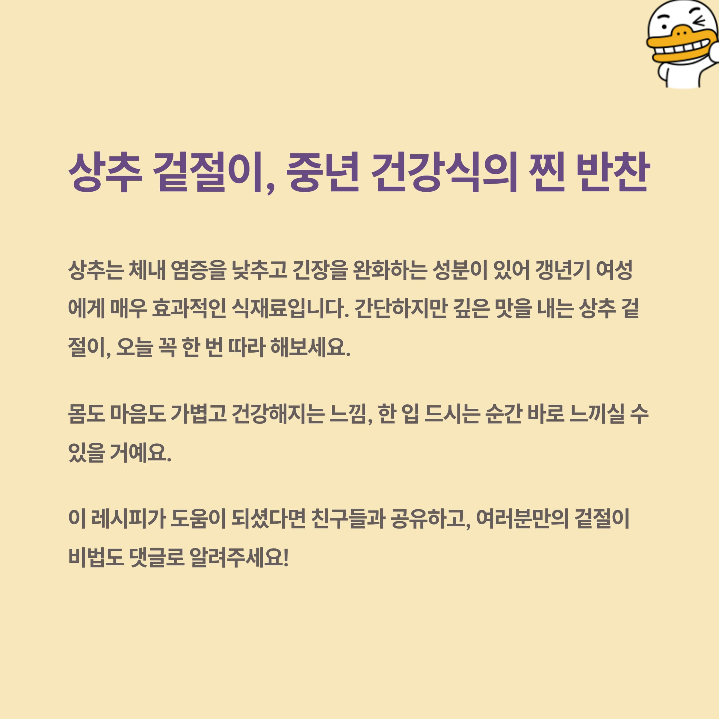 | 갱년기 중년 여성에게 딱! 부추 자박이(부추장) 황금레시피 (1) | 2025.05.21 |