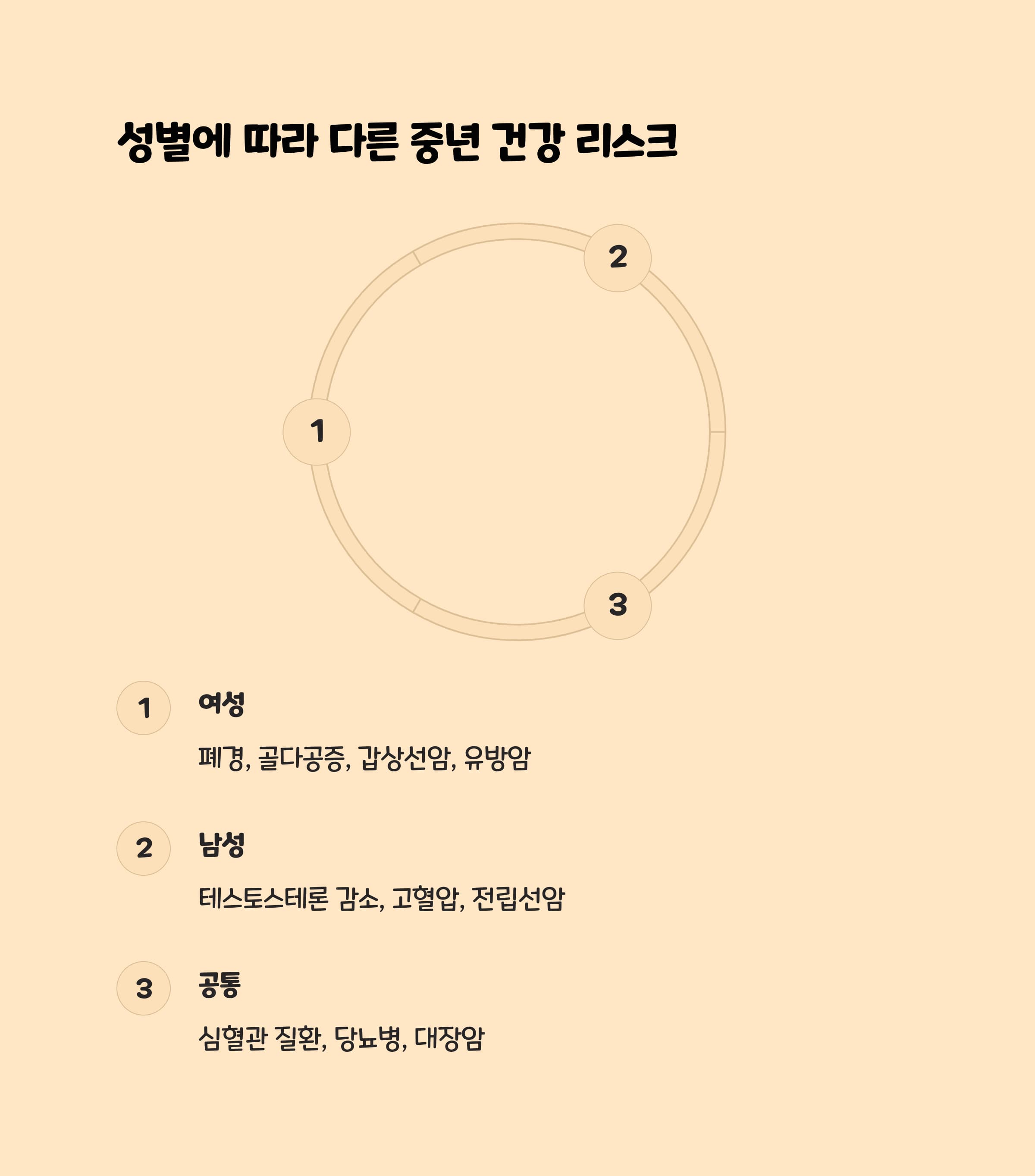 중년기에는 남성과 여성 모두 호르몬 변화를 겪으며 다양한 건강 문제가 나타납니다.