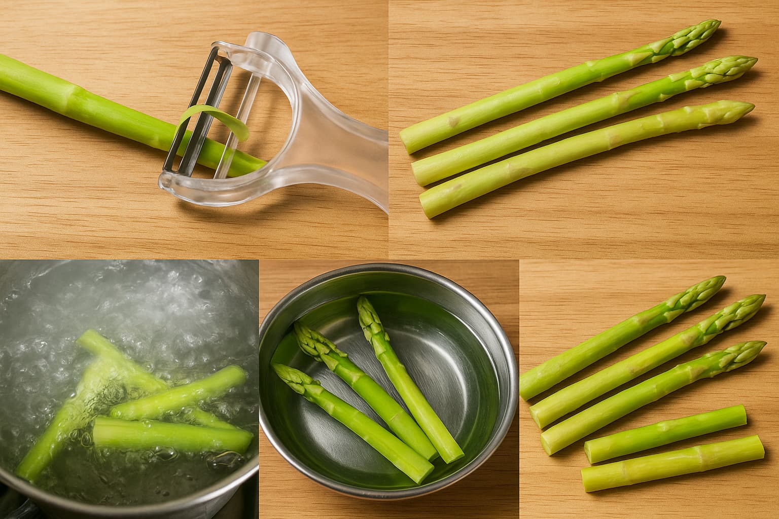 - 아스파라거스를 깨끗이 씻은 후, 끓는 물에 1분간 데쳐 준비