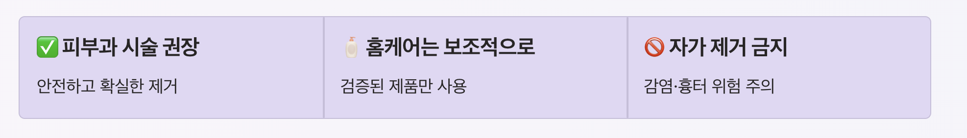| 제거 크림 | 간편, 저렴 | 효과 느림 | 보통 |